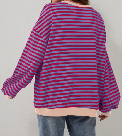 Brighten up your wardrobe with this eye-catching striped sweatshirt! Made from soft, comfortable fabric, it pairs easily with leggings or jeans. It also looks great layered under jackets, coats, vests, or cardigans, offering endless styling possibilities.